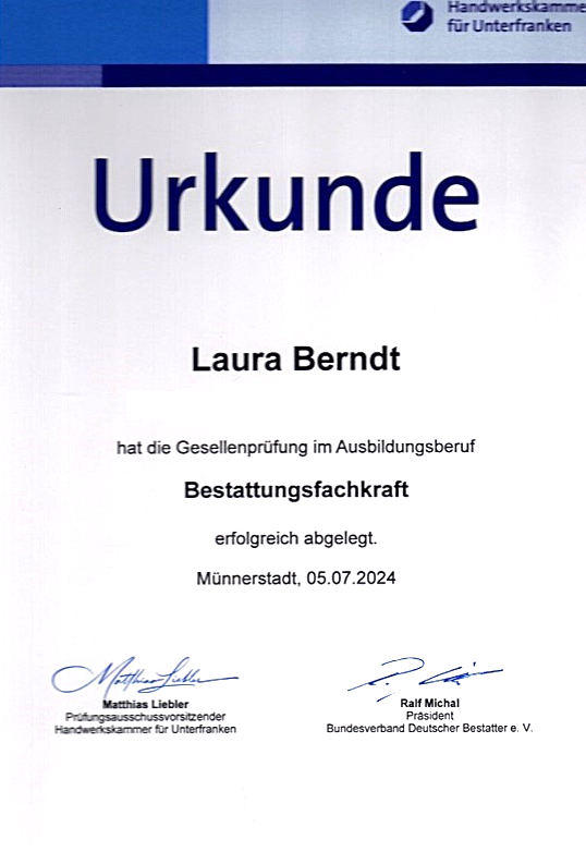 Ab dem 1. September 2024 begrüßen wir unsere neue Auszubildende. Tatenkräftige Unterstützung erhalten wird ab sofort von Frau Helen Freudenberg. Sie wird neben den Arbeitsalltag einer Bestattungsfachkraft ebenso in den theoretischen sowie praktischen Kenntnissen des Bestattungshandwerkes in Bad Kissingen und Münnerstadt unterrichtet.