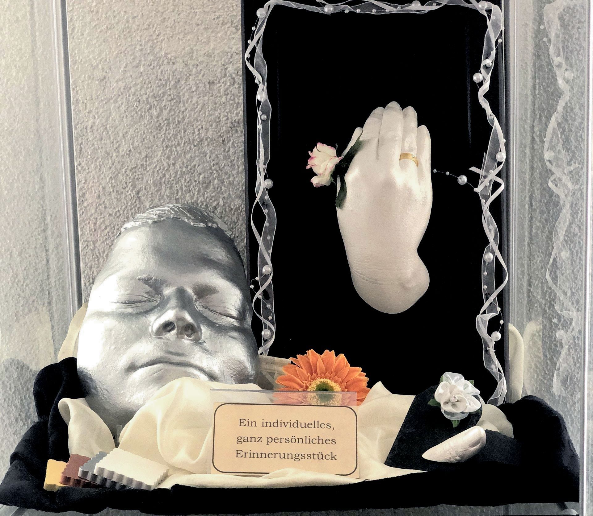 Totenmasken, Hand- oder auch Fingerabgüsse sind in all unseren Geschäftsstellen als Anschauungsmaterial ausgestellt, wie es auch im oberen Bild abgebildet ist. Dies gibt Ihnen die Möglichkeit sich mit den verschiedenen Varianten der Totenmasken und -abgüssen visuell und greifbar auseinanderzusetzen.